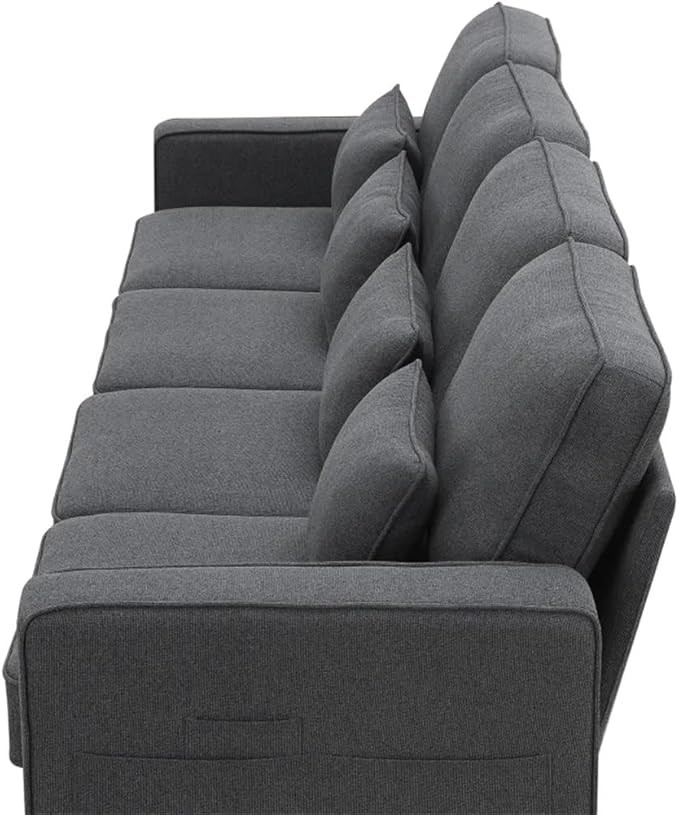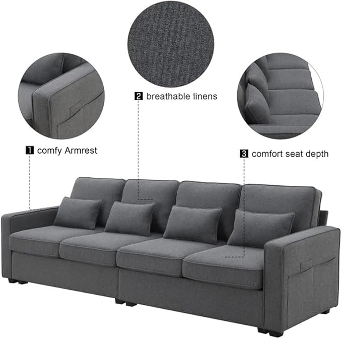 The sofa is made of solid wood frame,strong and . The seat bag is made of high-density sponge, which has good resilience. The linen fabric is characterized by absorption and breathability, thick and wear-resistant,it will not be stuffy when sitting for a long time. It has large seat depth, each seat can support 330lbs. very suitable for parties. To make the environment look neater,the sofa has some storage pockets on the side to storage magazines,phones,remote controls or others. High Adaptability: atmospheric design can meet many kinds of decoration . The large seat depth can brings you more comfortable feeling.
