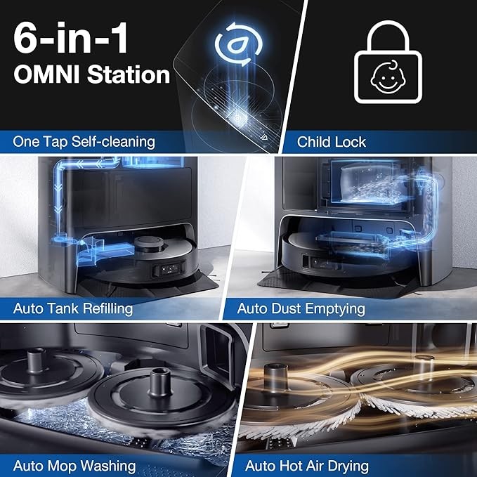 • All-IN-ONE OMNI STATION. A first in the industry. After vacuuming, your DEEBOT returns to station and automatically empties the dustbin. After mopping, it automatically washes the mop heads and dries them with hot air. Experience a whole new level of freedom from cleaning.
