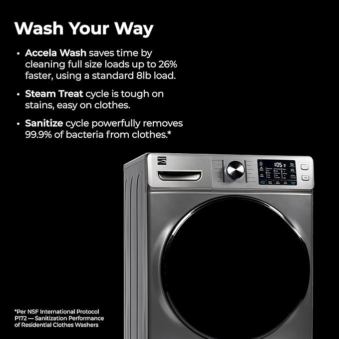 • Wash Your Way: Features a Sanitize cycle to remove 99.9% of bacteria (Per NSF International Protocol P172 - Sanitization Performance of Residential Clothes Washers), or use the Kids Wear cycle for powerful cleaning that handles everyday messes with ease