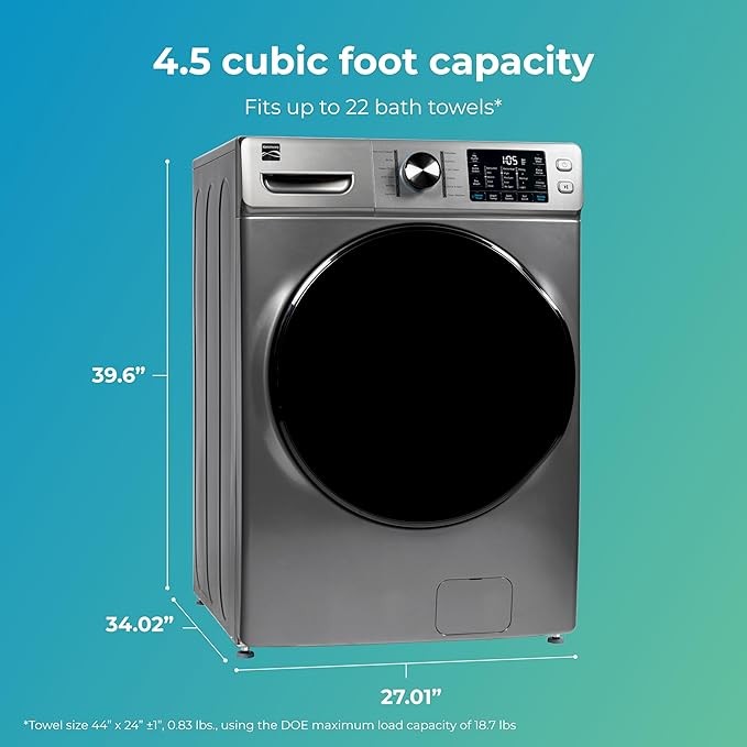 • This Kenmore front load washer has a 4.5 cubic foot capacity to wash all of your clothes, bedding, and other household fabric items. Our high-efficiency front load clothes washer reduces wash time with Accela Wash. Features a Steam Treat option to remove tough stains with the power of steam, has a Sanitize cycle, Kids Wear cycle, Cold Clean cycle, and easy to use touch controls that show wash status. It's also ENERGY STAR certified to help save money on utility bills.